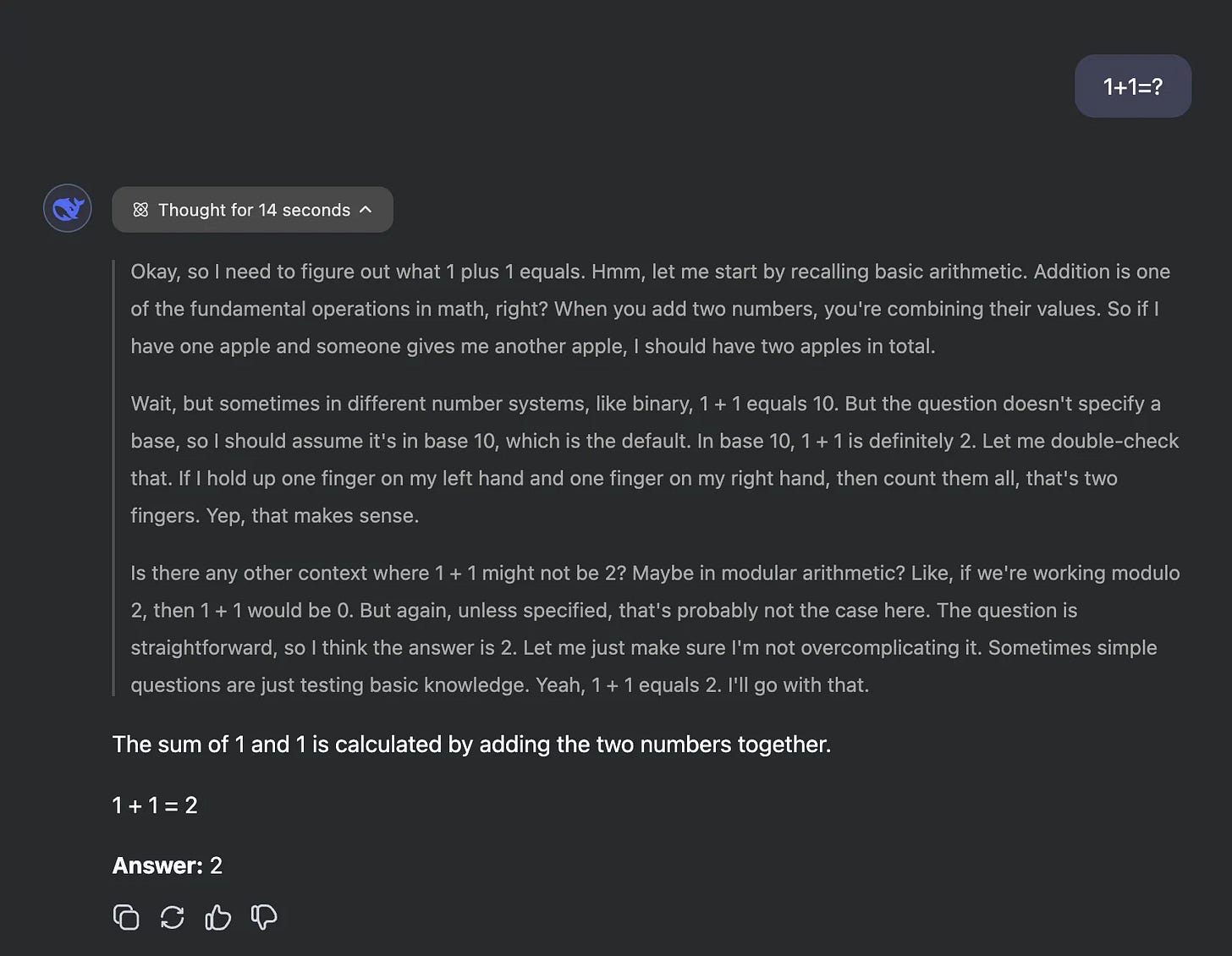 I think the idea of giving the model more time to respond is great. However, sometimes the model will have an overthinking problem, which is sometimes time- and compute-consuming. For example, when you ask R1 “1+1”, it will think for seconds (~100 tokens):